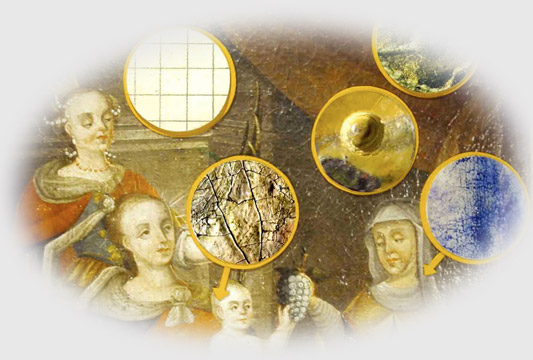 - Analisi microscopiche volte ad individuare i segni d’invecchiamento dello strato pittorico (craquelure più o meno evidente, stato dei pigmenti, presenza di eventuali restauri).